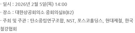 제2차 철강분야 탄소중립 기술협력 연구회(2/5, 중회의실 B) 폐타이어를 활용한 제품화기술 개발사업 선정 평가(2월말, 기후부 R&D) 바이오차를 이용한 토양기반 탄소저감사업 선정 평가(3월초, 기후부 R&D)