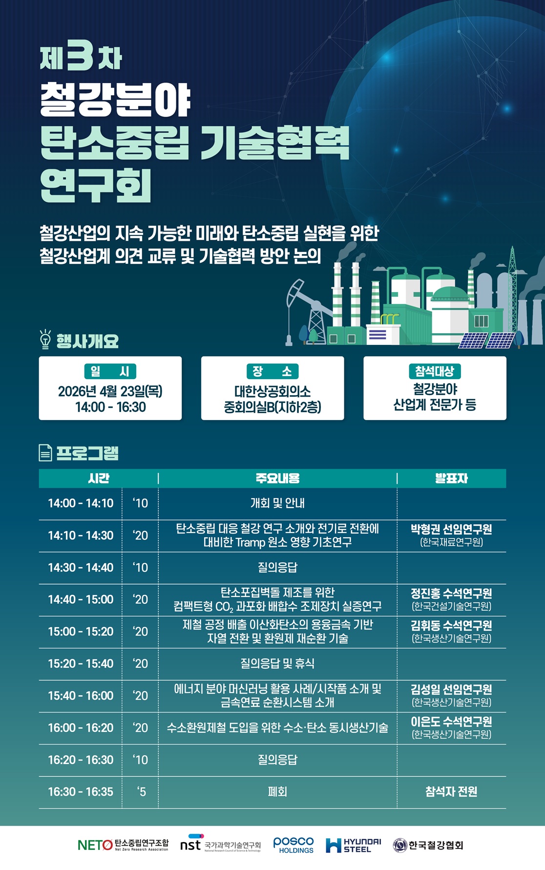 철강산업계 의견 교류 및 기술협력 방안을 논의하고자 제 3차 철강분야 탄소중립 기술협력 연구회를 개최하오니 많은 관심과 참석바랍니다.